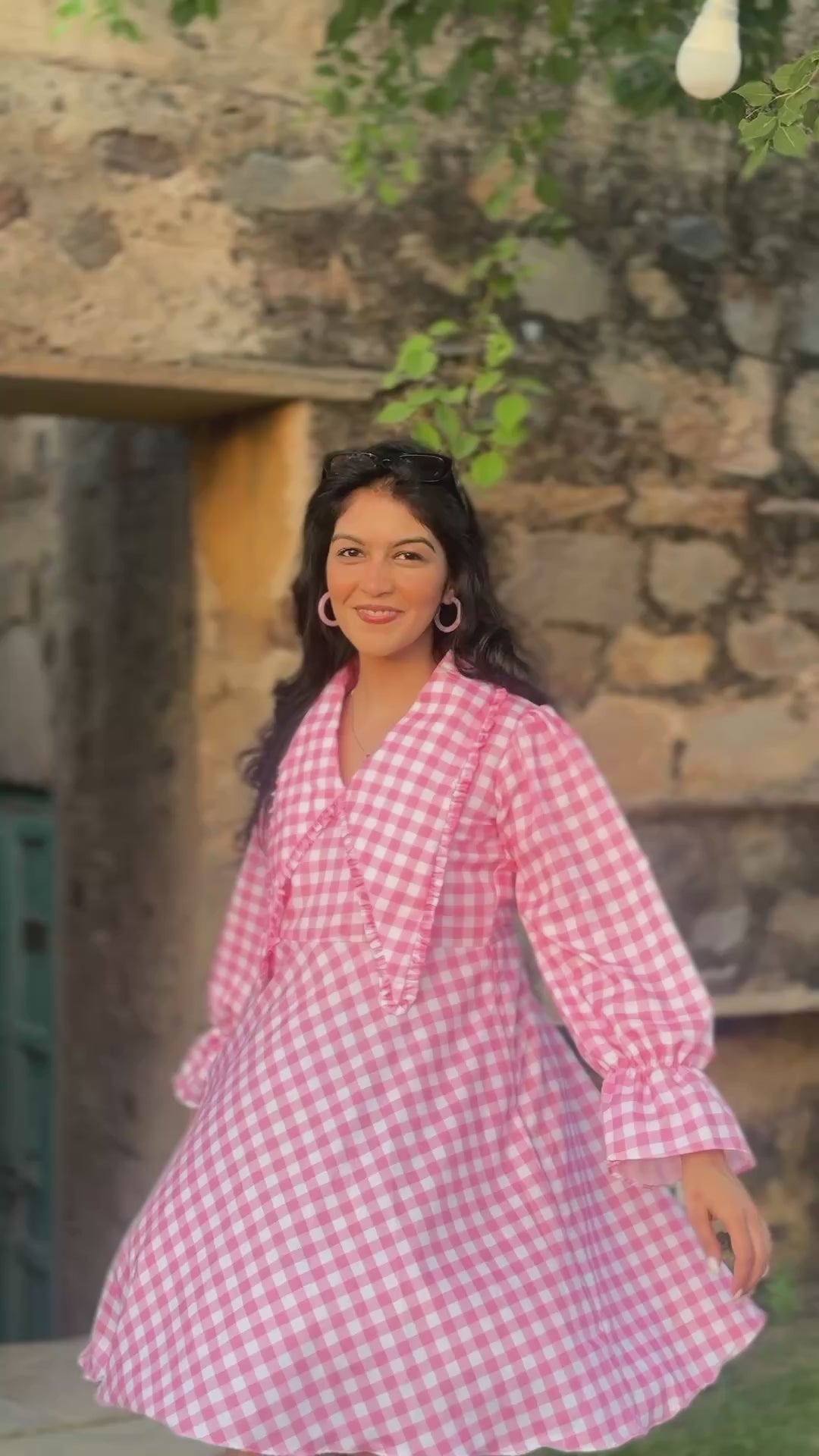 Gingham Pattern: The dress is adorned with a pink and white gingham print, giving it a fresh, playful vibe.
